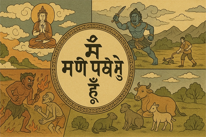 불교에서 가장 널리 알려진 진언 중 하나인 ‘옴 마니 반메 훔(Om Mani Padme Hum)’과 불교의 중요 개념 중 하나인 ‘육도윤회(六道輪廻)’.