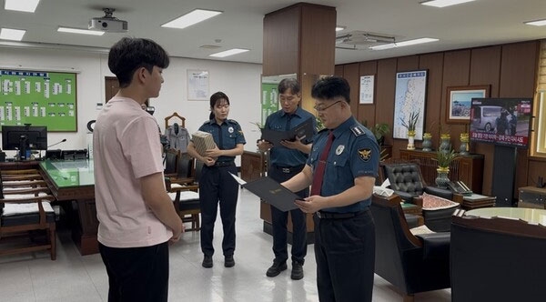 옥당중학교 2학년 김승현(15)군이 길에서 주은 160만 원을 경찰에 신고해 표창을 받고 있다. 사진=영광경찰서
