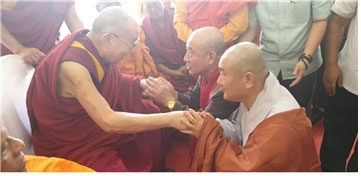 필자(오른쪽 두번째)를 알아보고 반갑게 손을 잡아주면서 미소 짓는 티베트의 정신적 지도자 달라이 라마 성하(2019년 11월 22일 인도 마하라스트라 주 아우랑가바드 태국사원)