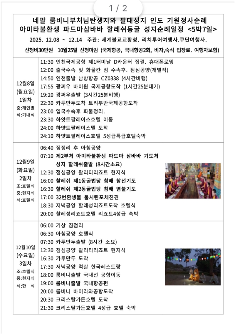 오는 12월 8일부터 14일까지 5박7일간 진행되는 이번 순례는 부처님 탄생지 네팔 룸비니와 인도 8대 성지 중 하나인 기원정사(스라바스티)를 포함한다.