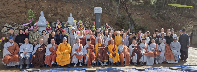 2일 천안 도광사에서 봉행된 삼성각 낙성식 및 백호당 큰스님 공덕비 봉행식, 지장보살·해수관세음보살 점안 대법회에서 응공선사(왼쪽)가 참석자들과 기념촬영을 하고 있다. 사진=WBM-TV