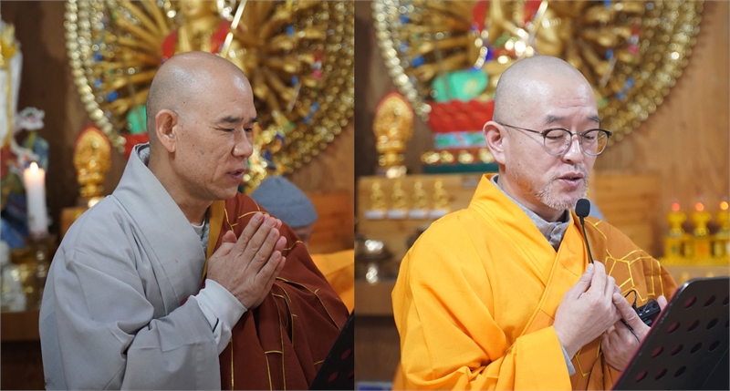 도일문도 실상사 주지 상호큰스님(왼쪽)과 능인문도회 회장 도연스님이 추모사를 하고 있다. 사진=WBM-TV