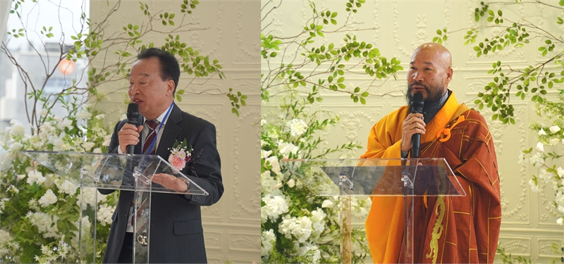 인사말을 하는 김용규 WBM-TV 회장(왼쪽)과 축사를 하는 대한불교전통조계종 총무원장 원산대승정. 사진=WBM-TV