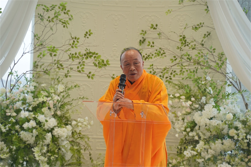 캘리포니아 국제대학교 한국명예총장이자 국제승가대학 학장인 법흥거사가 국제승가대학 제1기 졸업식에서 인사말을 하고 있다. 사진=WBM-TV