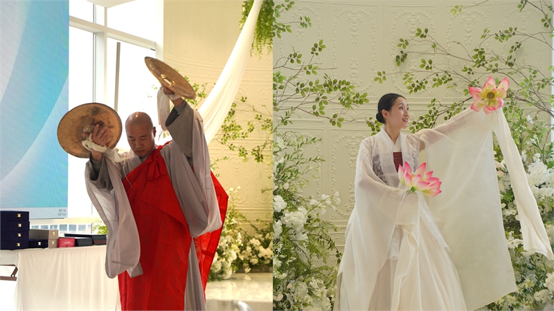 한국불교태고종 석굴암 주지 거불스님(왼쪽)과 유발상좌 화엄보살이 축하공연을 하고 있다. 사진=WBM-TV