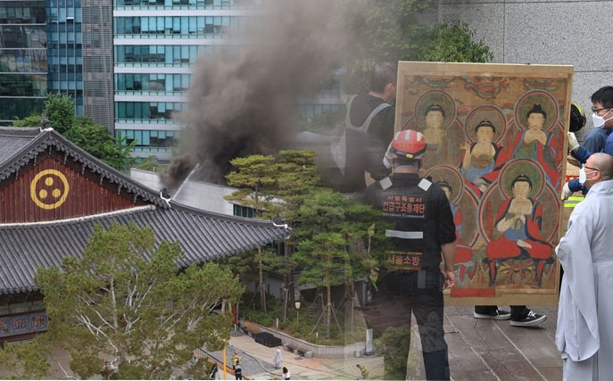 10일 오전 서울 종로구 조계사 인근 건물에서 화재가 발생해 박물관에 전시 중이던 문화재 일부가 긴급 반출됐다. 다행히 문화재 피해는 없는 것으로 확인됐다.