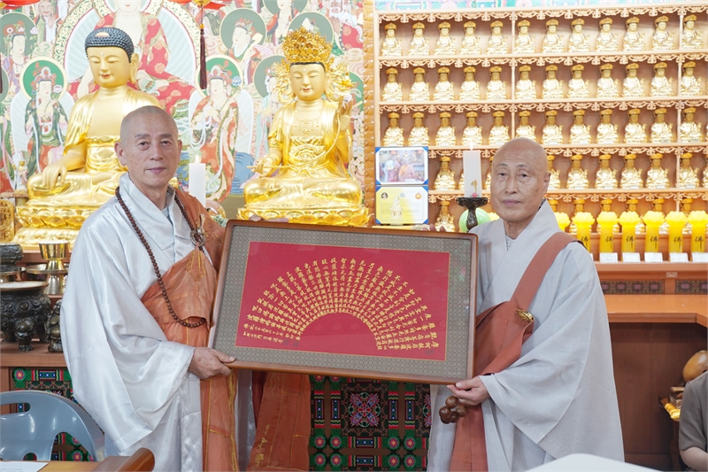 2일 대한불교전통조계종 서울본찰 대성사 개원 대법회에서 대한불교조계종 보명사 회주 원명 대종사(오른쪽)가 석능인 대승통에게 금강경 금박 액자를 전달하고 있다