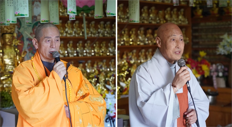 2일 천안 도광사에서 봉행된 삼성각 낙성식 및 백호당 큰스님 공덕비 봉행식, 지장보살·해수관세음보살 점안 대법회에서 세계불교교황청장 겸 대한불교전통조계종 종정 석능인 대승통(왼쪽)과 대한불교조계종 보명사 회주 원명 대종사가 각각 축하 법문을 하고 있다.