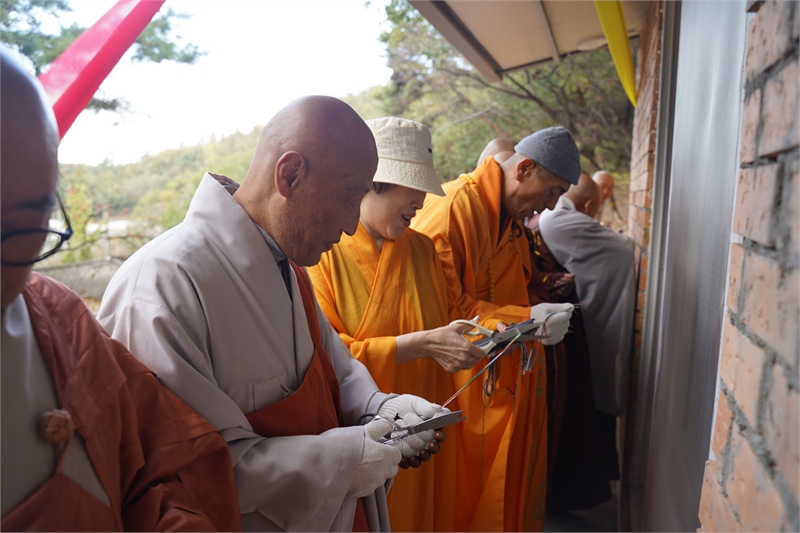 2일 천안 도광사에서 봉행된 삼성각 낙성식에서 대승고덕 스님들이 테이프 커팅을 하고 있다. 사진=WBM-TV