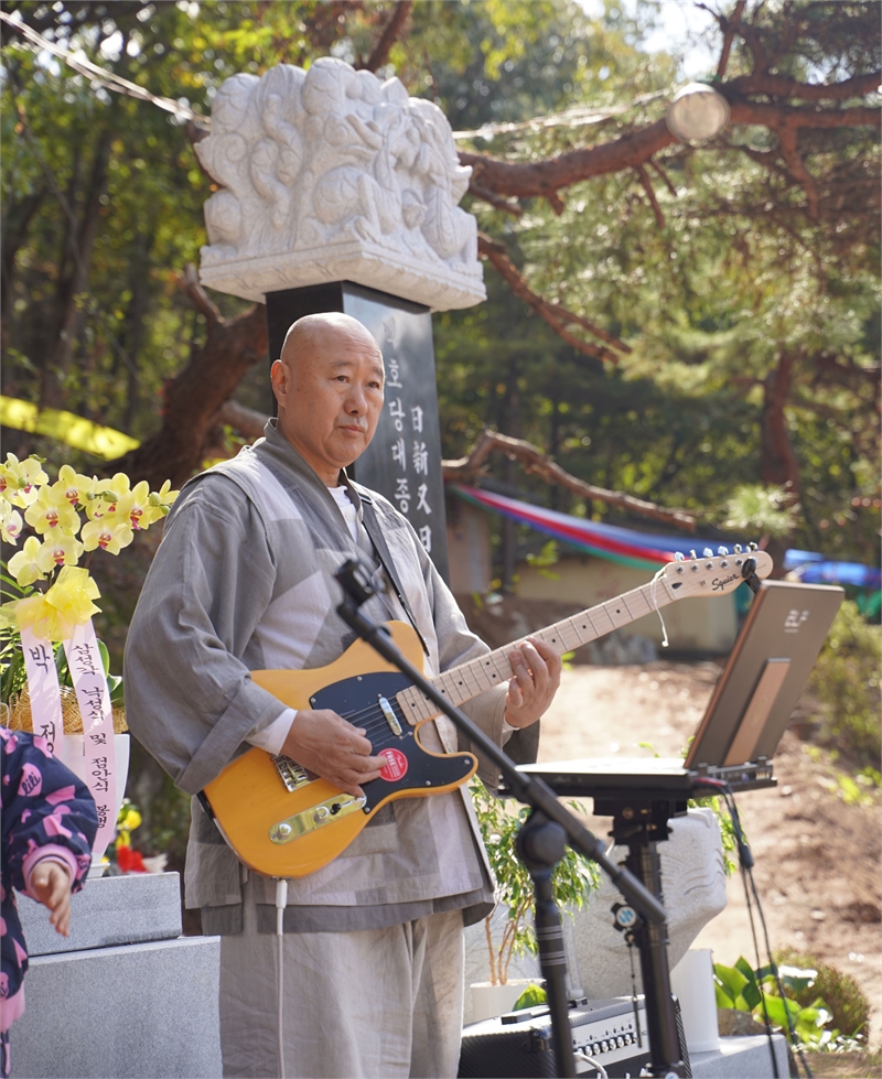 2일 천안 도광사에서 열린 산사음악회 및 축하공연에서 주지 혜자 스님이 기타 연주를 하고 있다. 사진=WBM-TV